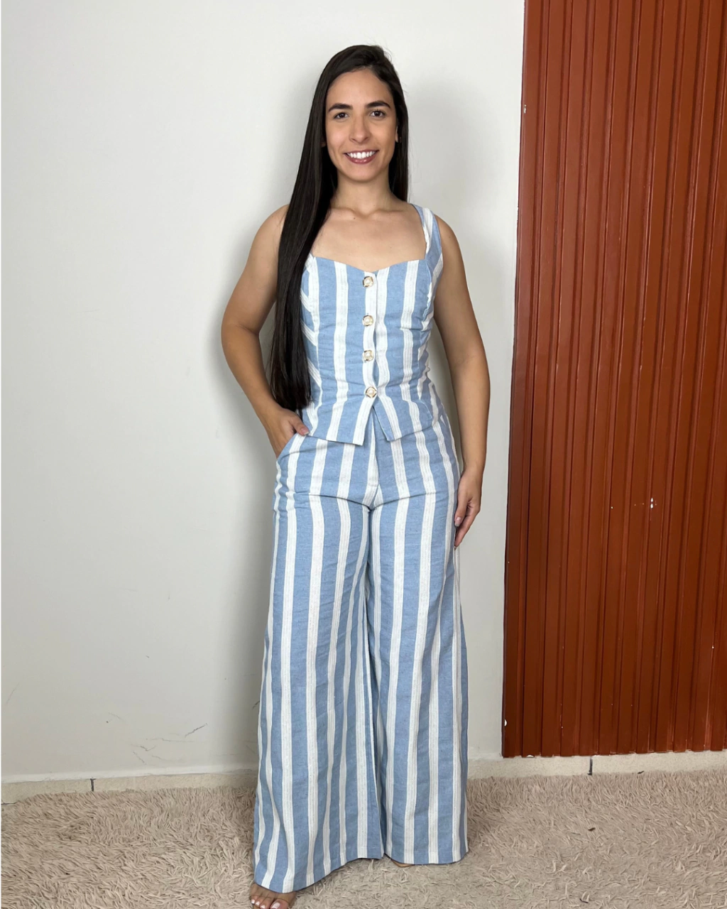 O cropped possui elástico nas costas e fechamento frontal com botões, enquanto a calça conta com cós elástico na parte de trás, garantindo ajuste perfeito.